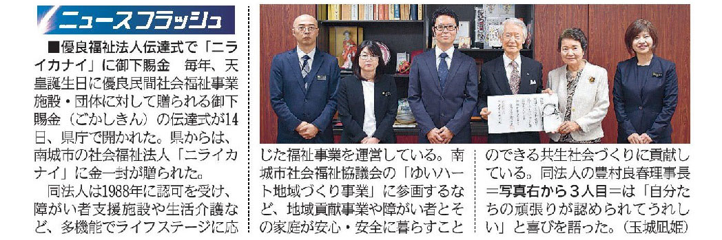 天皇陛下より、社会福祉法人ニライカナイが優良福祉事業として表彰されました。